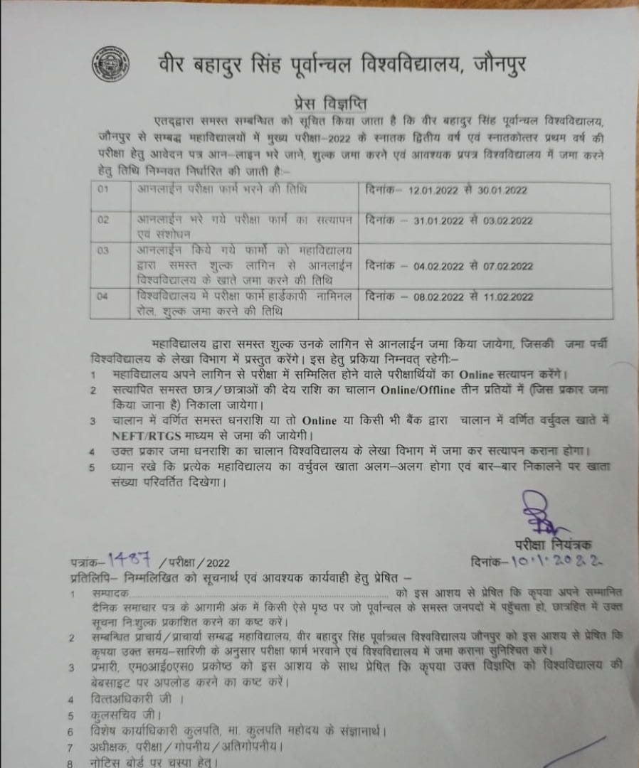 गाजीपुर। वीर बहादुर सिंह पूर्वांचल विश्व विद्यालय से सम्बद्ध स्वामी सहजानन्द स्नातकोत्तर महाविद्यालय में अध्ययनरत स्नातक द्वितीय वर्ष (बी.ए.एवं बी.काम.) तथा स्नातकोत्तर प्रथम वर्ष (एम.ए. हिन्दी, राजनीति शास्त्र, मनोविज्ञान, भूगोल, सैन्य विज्ञान) एम.काम. प्रथम वर्ष के छात्र/छात्राओं के मुख्य परीक्षा 2022 हेतु परीक्षा फार्म आवेदन दिनांक 12 जनवरी से तीस जनवरी 2022 तक आनलाईन भरे जायेंगे।