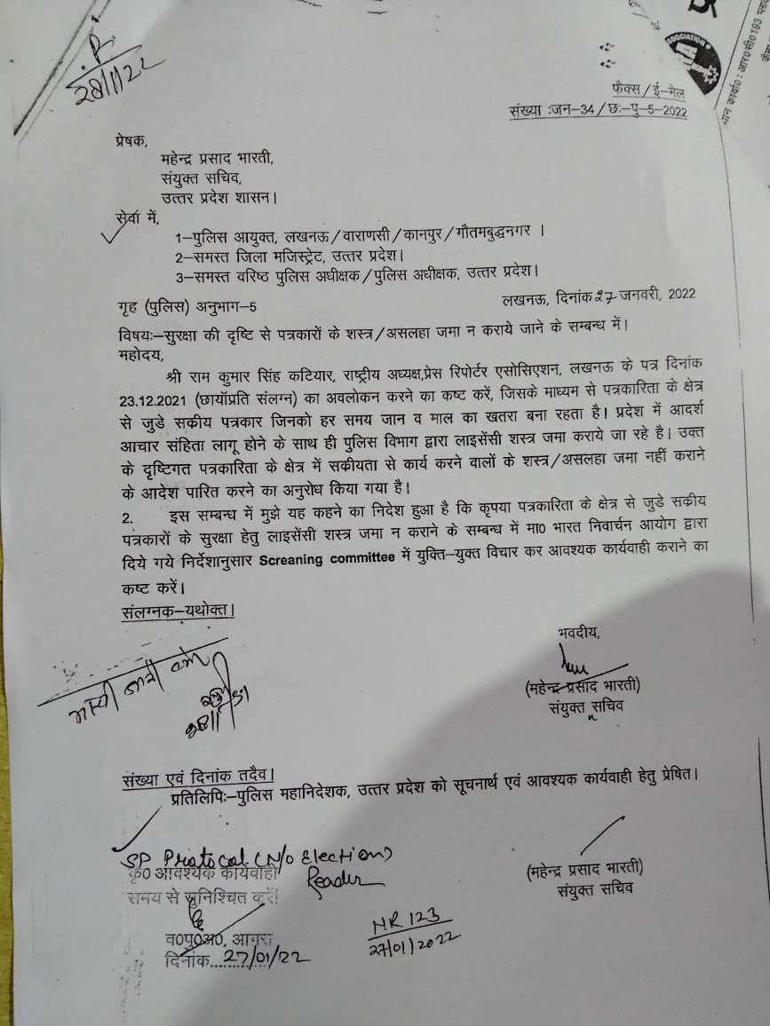 लखनऊ। उत्तर प्रदेश विधानसभा चुनाव के मद्देनजर जमा कराये जा रहे लोगों के लाइसेंसी असलहे जमा कराये जा रहे हैं। इस बार पत्रकारों के असलहे जमा न कराने के लिए शासन स्तर से आदेश जारी किया गया है। बताया गया है कि पत्रकार चुनाव के दौरान भी अपनी जान जोखिम में डालकर अपने कार्यों को अंजाम देते हैं, ऐसे में उनकी सुरक्षा आवश्यक है। अपने पत्रकारिता कार्य के दौरान पत्रकार कलम,कैमरा के साथ अपना लाइसेंसी असलहा भी रख सकेंगे।