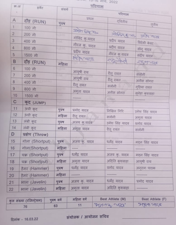 समारोह के 100 मीटर दौड़ के पुरुष संवर्ग में उमेश सिंह यादव को प्रथम, गोविंद यादव को द्वितीय, तथा प्रदीप यादव को तृतीय स्थान मिला। प्रतियोगिता में अजय कुमार यादव तथा अमृता यादव को क्रमशः पुरुष तथा महिला संवर्ग में ओवरआल अंकों के आधार पर चैंपियनशिप प्रदान की गई।