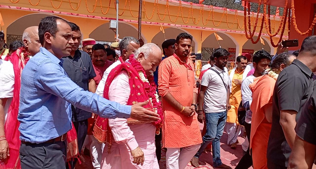 उन्होंने महामंडलेश्वर स्वामी भवानीनंदन यति महाराज से विचार विनिमय करते हुए उनका आशीर्वाद प्राप्त किया। सिद्धपीठ में आने को उन्होंने अपना सौभाग्य बताते हुए कहा कि इस सिद्धपीठ की मिट्टी चंदन के समान है। यहां आने से देश कार्य, देव कार्य और धर्म कार्य, तीनों हो रहे हैं। उन्होंने कहा कि यह वर्ष महामंडलेश्वर स्वामी भवानी नन्दन यति जी महाराज के रजत जयंती समारोह का समापन वर्ष है। उन्होंने कहा कि मुझे यहां पहले ही आना था परन्तु कोरोना के चलते न आ सका, परन्तु आज शहीदी दिवस के पावन अवसर पर आया हूँ। राष्ट्रीय उन्नयन अधिष्ठान विषयक संगोष्ठी व धार्मिक अनुष्ठान कार्यक्रम में सरसंघचालक डॉ मोहन भागवत ने ब्रम्हलीन महामंडलेश्वर महंत श्री बालकृष्ण यती जी के चित्र पर दीप प्रज्वलित करते हुए कहा कि आज का दिन महत्वपूर्ण दिन है। जो शहीद भगत सिंह,सुखदेव,