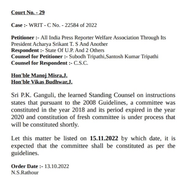 इसमें विभाग द्वारा लगातार हिला हवाली किया जाता रहा। जिसको दृष्टिगत रखते हुए न्यायमूर्ति मनोज मिश्र एवं न्यायमूर्ति विकास बुधवार की खंडपीठ ने दिनांक 13 अक्टूबर 2022 को कड़ा रुख दिखाते हुए सूचना एवं जनसंपर्क विभाग उत्तर प्रदेश को सख्त निर्देश देते हुए कहा कि उत्तर प्रदेश प्रेस मान्यता समिति को गठित कर दिनांक 15 नवंबर 2022 को न्यायालय को सूचित करें।