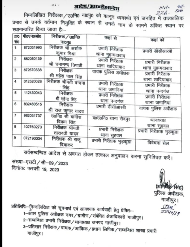 गाज़ीपुर । जिले की कानून व्यवस्था को दुरुस्त करने एवं जनहित के मद्देनजर पुलिस अधीक्षक ओमवीर सिंह ने तात्कालिक प्रभाव से तबादला एक्सप्रेस को झंडी देकर रवाना किया है। इसकी जद में कई निरीक्षक व उपनिरीक्षक आ गये हैं। उन्हें उनके वर्तमान नियुक्ति के स्थान से स्थानांतरित करते हुए नयी नियुक्ति दी गयी है। इसी क्रम में निरीक्षक अशोक कुमार मिश्रा प्रभारी निरीक्षक थाना मुहम्मदाबाद को प्रभारी डीसीआरबी, निरीक्षक घनानन्द त्रिपाठी निरीक्षक प्रभारी निरीक्षक थाना शादियाबाद को प्रभारी निरीक्षक थाना मुहम्मदाबाद, निरीक्षक महेश पाल सिंह वाचक पुलिस अधीक्षक को प्रभारी निरीक्षक थाना शादियाबाद, निरीक्षक श्रीमती वन्दना सिंह प्रभारी निरीक्षक थाना जमानियां को प्रभारी निरीक्षक थाना नन्दगंज, निरीक्षक महेन्द्र सिंह प्रभारी निरीक्षक थाना नन्दग़ज को प्रभारी निरीक्षक थाना जमानियां, निरीक्षक राज कुमार यादव प्रभारी डीसीआरबी को वाचक पुलिस अधीक्षक, उपनिरीक्षक बागीश विक्रम सिंह वरिष्ठ उपनिरीक्षक थाना सैदपुर को थानाध्यक्ष सुहवल, निरीक्षक श्रीमती तारावती यादव प्रभारी निरीक्षक थाना सुहवल को प्रभारी निरीक्षक भुड़कुड़ा,निरीक्षक राजू दिवाकर प्रभारी निरीक्षक भुड़कुड़ा को विवेचना सेल में स्थानांतरित किया गया है।