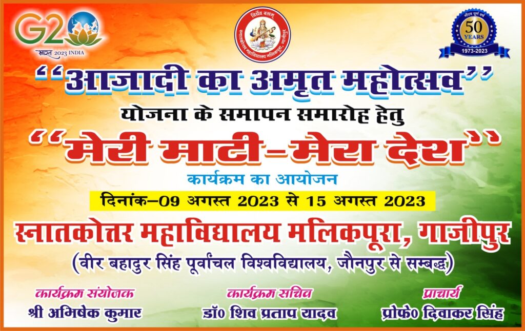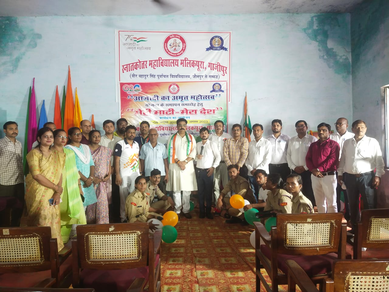 प्राचार्य प्रो. दिवाकर सिंह की अध्यक्षता व वरिष्ठ पत्रकार डॉ.ए.के. राय के मुख्य आतिथ्य में सम्पन्न कार्यक्रम में आजादी के अमृत महोत्सव के समापन अन्तर्गत “मेरी माटी, मेरा देश” कार्यक्रम के आयोजन के साथ ‘पंच प्रण शपथ’ ली गयी। कार्यक्रम संयोजक अभिषेक कुमार व कार्यक्रम सचिव डा. शिव प्रताप यादव के निर्देशन में आयोजित कार्यक्रम में वक्ताओं ने स्वतंत्रता दिवस की महत्ता पर प्रकाश डालते हुए आज़ादी की लड़ाई के अमर शहीदों को याद कर उनके आदर्शों से प्रेरणा लेने की सलाह दी।