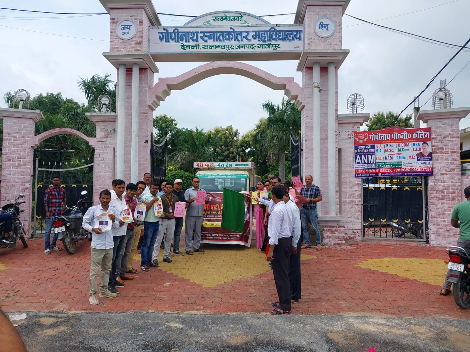 जागरूकता चेतना रथ को कासिमाबाद में गोपीनाथ पी.जी. महाविद्यालय के संरक्षक राकेश त्रिपाठी, महाविद्यालय की प्रधानाचार्या श्रीमती सुधा त्रिपाठी और ग्राम देवली के ग्राम प्रधान हीरालाल चौहान ने संयुक्त रूप से हरी झंडी दिखाकर रवाना किया।