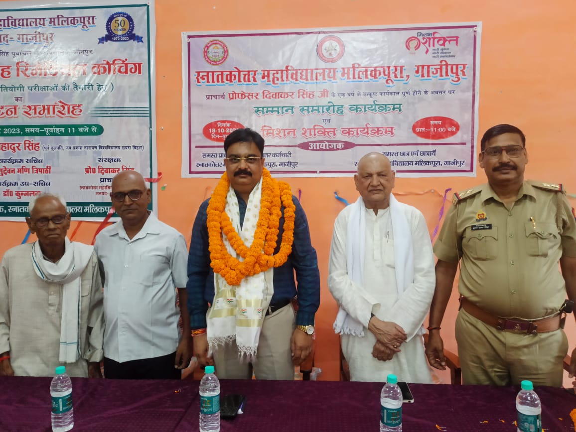 पीजी कॉलेज मलिकपुरा के संस्थापक स्व.भगवान सिंह के अनुज डॉ. हरिप्रसाद सिंह की अध्यक्षता में आयोजित समारोह को सम्बोधित करते हुए मुख्य अतिथि प्रो. हरिकेश बहादुर सिंह पूर्व कुलपति जयप्रकाश नारायण विश्व विद्यालय छपरा, बिहार ने आयोजित प्राचार्य सम्मान समारोह को संबोधित करते हुए व्यक्त किया। उन्होंने कहा कि अपने एक वर्ष के कार्यकाल में प्रोफेसर दिवाकर सिंह ने महाविद्यालय को विकास के पद पर अग्रसर किया है और हमें विश्वास है कि उनके निर्देशन में महाविद्यालय लगातार विकास के पथ पर बढ़ता रहेगा। विशिष्ट अतिथि डा. ए.के. राय ने महाविद्यालय के विकास कार्यों की प्रगति पर प्राचार्य को बधाई देते हुए हर सहयोग देने का आश्वासन दिया। प्राचार्य प्रोफेसर दिवाकर सिंह ने महाविद्यालय की विकास यात्रा को निरन्तर प्रगति के पथ पर बढ़ाने का आश्वासन देते हुए इस कार्य में क्षेत्र से सहयोग की मांग की।