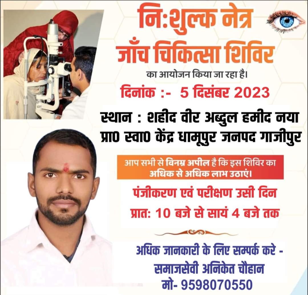 गाजीपुर। शहीद वीर अब्दुल हमीद नया प्राथमिक स्वास्थ्य केंद्र धामूपुर, दुल्लहपुर में निःशुल्क नेत्र चिकित्सा शिविर का आयोजन पांच दिसम्बर को किया गया है।