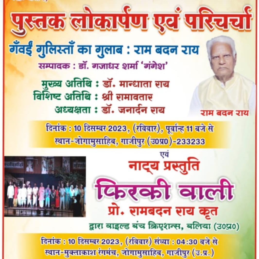 गाजीपुर। डॉ. गजाधर शर्मा ‘गंगेश द्वारा संपादित पुस्तक “गँवई गुलिस्ताँ का गुलाब : राम बदन राय, का लोकार्पण व जनचर्चा जनपद के जोगा मुसहिब ग्राम में 10 दिसंबर, 2023 को पूर्वान्ह 11.00 बजे से आयोजित की गयी है।