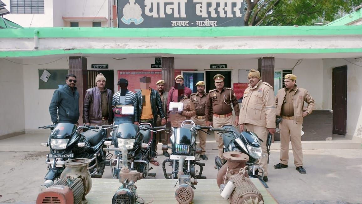 अपराधियों, चोरों/लुटेरों आदि के विरुद्ध चलाये जा रहे विशेष अभियान व वाहन चोरी/चोरी/नकबजनी आदि की घटना के अनावरण हेतु चलाये गये अभियान के तहत थाना बरेसर पुलिस टीम द्वारा मुखबिर की सूचना पर, वर्ष के प्रथम दिन क्षेत्र के ग्राम मलिकपुरा के एफसीआई गोदाम के पास से तीन अभियुक्तों को गिरफ्तार किया। उनके कब्जे से जनपद गाजीपुर के थाना बरेसर, कासिमाबाद, मुहम्मदाबाद व थाना कोतवाली क्षेत्र से चोरी की गई चार मोटर साइकिल , दो विद्युत मोटर, दो टुल्लू पम्प व ग्यारह हजार चार सौ रुपये नगद तथा दो तमंचा .315 बोर मय जिन्दा कारतूस .315 बोर बरामद हुआ।