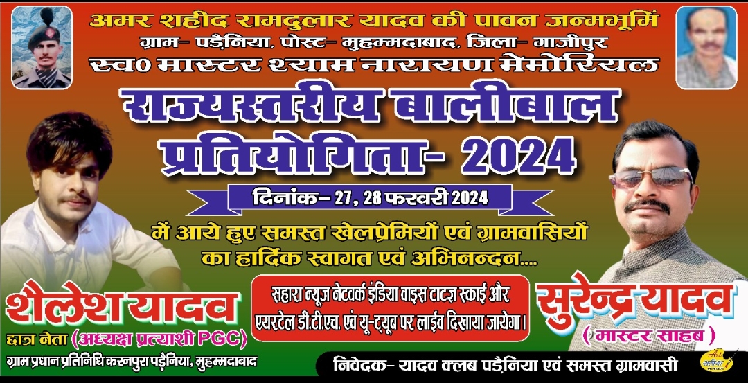 गाजीपुर। कारगिल वीर अमर शहीद रामदुलार यादव की पावन भूमि मुहम्मदाबाद क्षेत्र के ग्राम पड़ैनिया में स्व. मास्टर श्याम नारायण यादव की स्मृति में दो दिवसीय बालीबाल प्रतियोगिता 27 फ़रवरी दिन को प्रातः 10 बजे से आरम्भ होगी।