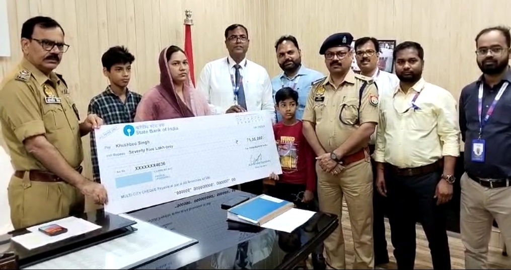गाज़ीपुर। पुलिस अधीक्षक ओमवीर सिंह द्वारा स्टेट बैंक ऑफ इंडिया के आर एम की उपस्थिति में मंगलवार को, पुलिस सैलरी पैकेज के तहत मिलने वाले लाभ के रूप में रुपये 75 लाख का चेक मृतक आरक्षी संदीप कुमार सिंह की पत्नी को प्रदान किया गया।
