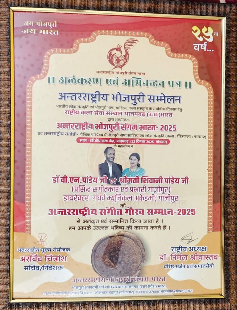 “अंतरराष्ट्रीय संगीत गौरव सम्मान” से सम्मानित हुए डॉ. विद्या निवास पाण्डेय