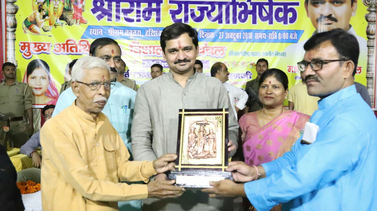 सर्वप्रथम कार्यक्रम के मुख्य अतिथि एमएलसी विशाल सिंह चंचल एवं विशिष्ट अतिथि सरिता अग्रवाल एवं अन्य गणमान्य अतिथियों ने प्रभु श्री राम को तिलक व माला पहनाकर विधिवत पूजा अर्चन किया। इसके बाद मंच पर विराजमान हुए कमेटी के पदाधिकारियों एवं सदस्यों तथा गणमान्य लोगों द्वारा अतिथियों का माल्यार्पण कर स्वागत किया गया। मुख्य अतिथि ने अपने संबोधन में अति प्राचीन रामलीला कमेटी हरिशंकरी के सम्मानित पदाधिकारी एवं सदस्यों के साथ जिले की जनता को राज्याभिषेक के अवसर पर बधाई दी । उन्होंने कहा कि सैकड़ों साल पुरानी इस महान परंपरा को कमेटी व यहां के लोग, गाजीपुर की जनता इतनी भव्यता के साथ रामलीला मंचन का कार्य कराती आ रही है। यहां आने के बाद मुझे बहुत ही प्रसन्नता और गर्व की अनुभूति होती है। इन लीलाओं व मंचन के कार्य को देखने के बाद यह महसूस होता है कि यहां के लोगों के अंदर प्रभु श्री राम के प्रति गहरी आस्था है। मैं भी राम भक्त हूं। प्रभु श्रीराम में मेरी गहरी आस्था है और वर्तमान सरकार में एक विधायक होने के नाते मुझे यह कहने में कोई गुरेज नहीं है कि देश की जनता की भावना के अनुरूप उत्तर प्रदेश की योगी व केंद्र की मोदी सरकार अयोध्या में प्रभु श्री राम का मंदिर आपसी बातचीत नहीं तो संसद में अध्यादेश लाकर राम मंदिर का भव्य निर्माण का रास्ता साफ करने के प्रति कटिबद्ध है। विशिष्ट अतिथि सरिता अग्रवाल ने अपने संबोधन में कहा कि मैं इसी वार्ड की रहने वाली हूँ। वर्षों से इस रामलीला मंचन को देखती आ रही हूं। मेरी प्रभु श्रीराम में गहरी आस्था है।वर्तमान समय में श्री राम के द्वारा बताए हुए रास्ते पर चलकर समाज को संगठित व मजबूत बनाने के साथ-साथ हर मजहब और धर्म के लोग मिलकर नगर को स्वच्छ व विकास की तरफ ले जाएं, यही मेरी अपील है। उन्होंने इस अवसर पर कमेटी व जनता को राज्याभिषेक के साथ ही छठ और दीपावली की बधाई दी। कार्यक्रम के दौरान नगर में स्थापित दुर्गा प्रतिमाओं के पंडाल व रामलीला के दौरान अपने कार्य को मुख्य अतिथि एवं विशिष्ट अतिथि के द्वारा पुरस्कार व प्रशस्ति पत्र देकर सम्मानित किया गया। इसके बाद आए हुए अतिथियों को कमेटी के मंत्री, अध्यक्ष व पदाधिकारियों द्वारा स्मृति चिन्ह देकर सम्मानित किया गया।