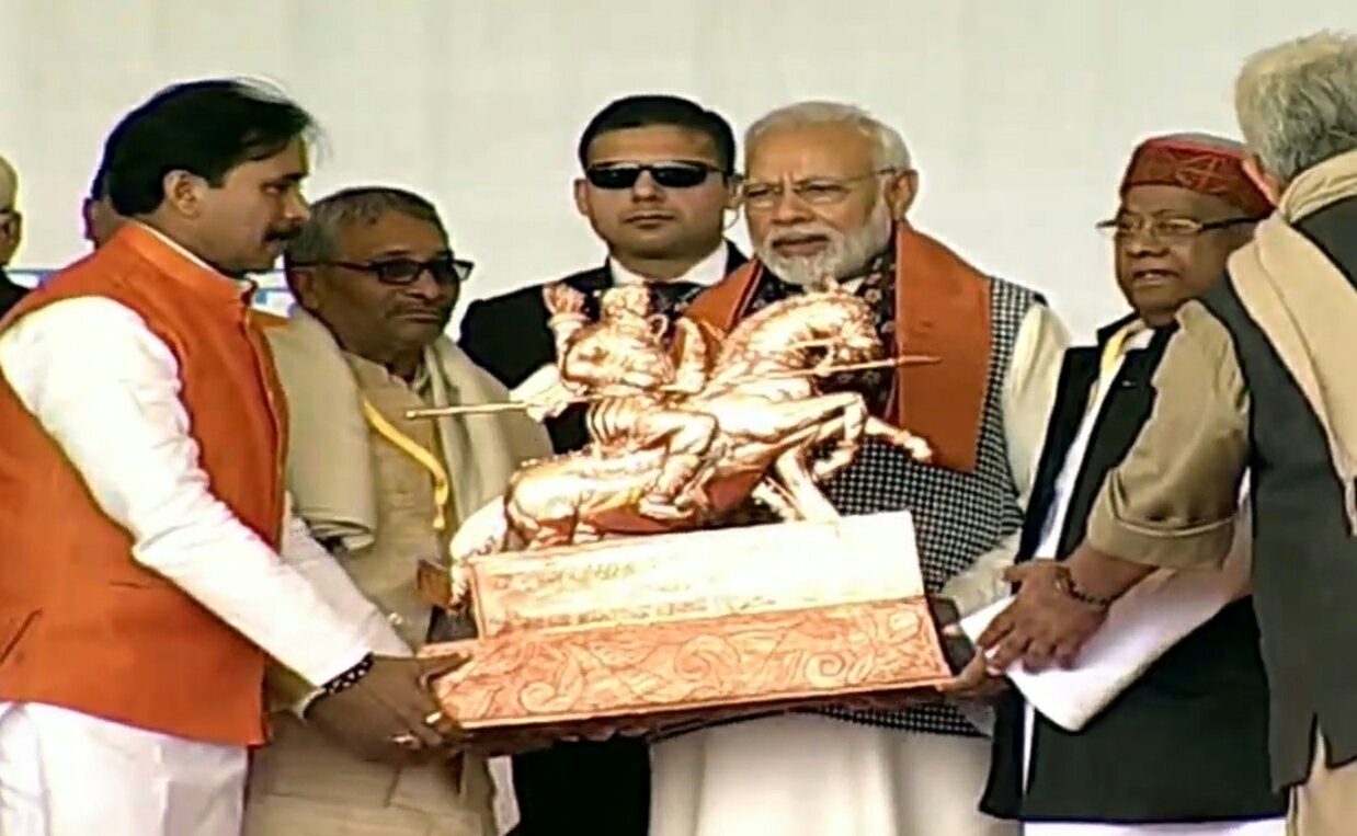 इससे पूर्व मनोज सिन्हा द्वारा प्रधानमंत्री, को अंगवस्त्रम देकर तथा घोसी सांसद हरिनारायण राजभर, राज्य सभा सांसद सकलदीप तथा प्रदेश के मंत्री अनिल राजभर द्वारा सम्मिलित रुप से महाराज सुहेलदेव का स्मृति चिन्ह देकर सम्मानित किया गया।