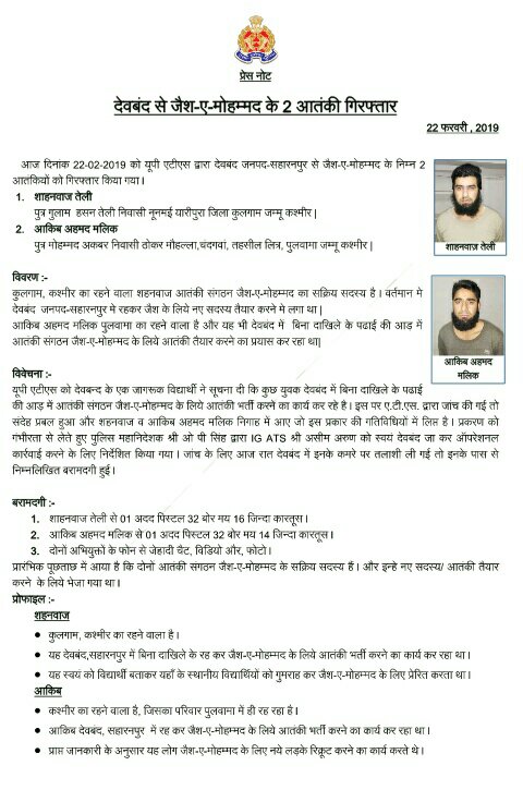 लखनऊ(उत्तर प्रदेश),22 फरवरी 2019। प्रदेश पुलिस के आतंक रोधी दस्ते (एटीएस)ने आतंकवादी संगठन जैश ए मोहम्मद के दो संदिग्ध सदस्यों को कल रात सहारनपुर के देवबंद से गिरफ्तार कर लिया। पुलिस महानिदेशक ओम प्रकाश सिंह ने आज पत्रकार वार्ता में बताया कि यूपी एटीएस को सूचना मिली थी कि देवबंद में जैश ए मोहम्मद से जुड़े दो आतंकवादी छात्र बनकर रह रहे हैं। इस सूचना पर सर्विलांस की मदद से उनकी विस्तृत जानकारी मिली। जांच पड़ताल में शक पुख्ता होने पर कल रात दोनों को दबोच लिया गया। बताया गया कि गिरफ्तार संदिग्ध आतंकवादियों की उम्र 20 से 25 साल के बीच है। इनमें से एक शाहनवाज जम्मू कश्मीर के कुलगाम का तो उसका साथी आकिब अहमद पुलवामा का निवासी है। पुलिस ने उनके पास से कुछ हथियार, मोबाइल में वीडियो, कुछ फोटोग्राफ तथा कुछ अन्य संदिग्ध सामग्री बरामद की गई है जिसके आधार पर अन्य जानकारियां हासिल की जा रही हैं। श्री सिंह ने बताया कि शाहनवाज और आकिब अहमद अपने संगठन में युवकों की भर्ती के लिए उत्तर प्रदेश आए थे। शुरुआती पूछताछ में पता चला है कि इनमें से शाहनवाज बम बनाने में माहिर होने के साथ-साथ आतंकवाद का प्रशिक्षण भी देता है। पुलिस महानिदेशक ने कहा कि दोनों को ट्रांजिट रिमांड पर लखनऊ लाकर अदालत में पेश किया जाएगा और फिर इनसे पूछताछ कर अन्य जानकारियां प्राप्त की जायेंगी।