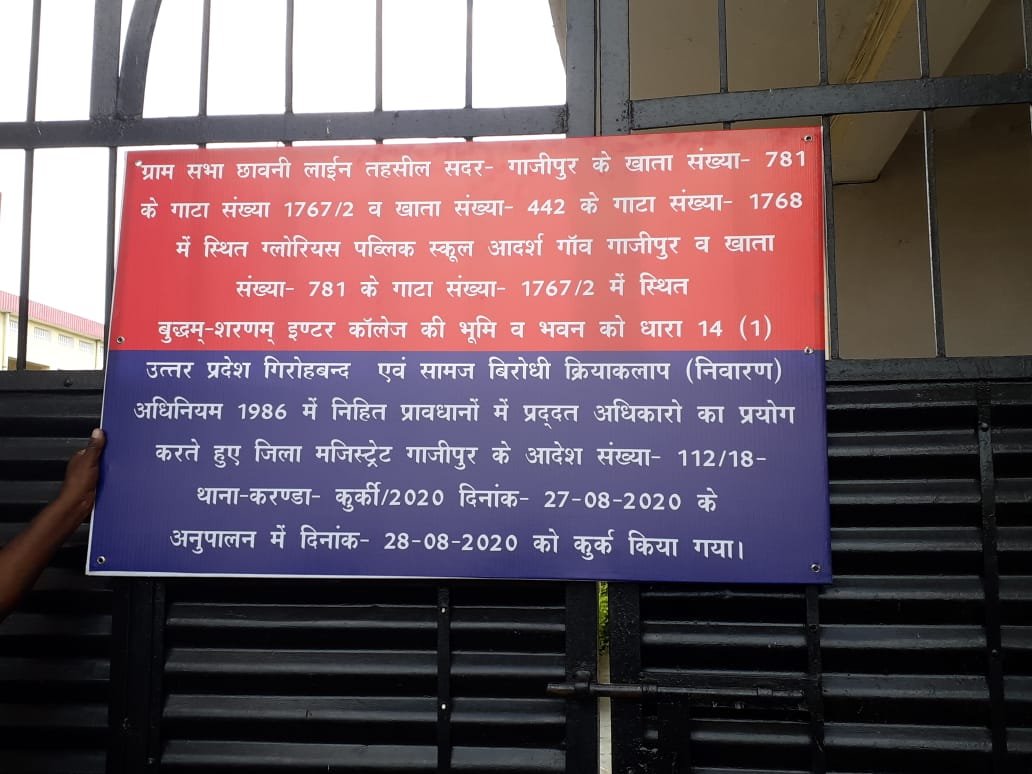 एसडीएम सदर प्रभास कुमार के अनुसार शिक्षा माफिया पारसनाथ कुशवाहा के छावनी लाइन गाजीपुर के बुद्धम् शरणम् इंटर कालेज व ग्लोरियस पब्लिक स्कूल आदर्श गांव की भूमि व भवन को उत्तर प्रदेश गिरोहबंद एवं समाज विरोधी क्रियाकलापों अधिनियम 1986 में निहित प्राविधानों में प्रदत अधिकारों का प्रयोग करते हुए जिला मजिस्ट्रेट के आदेश से कुर्क की गयी है।