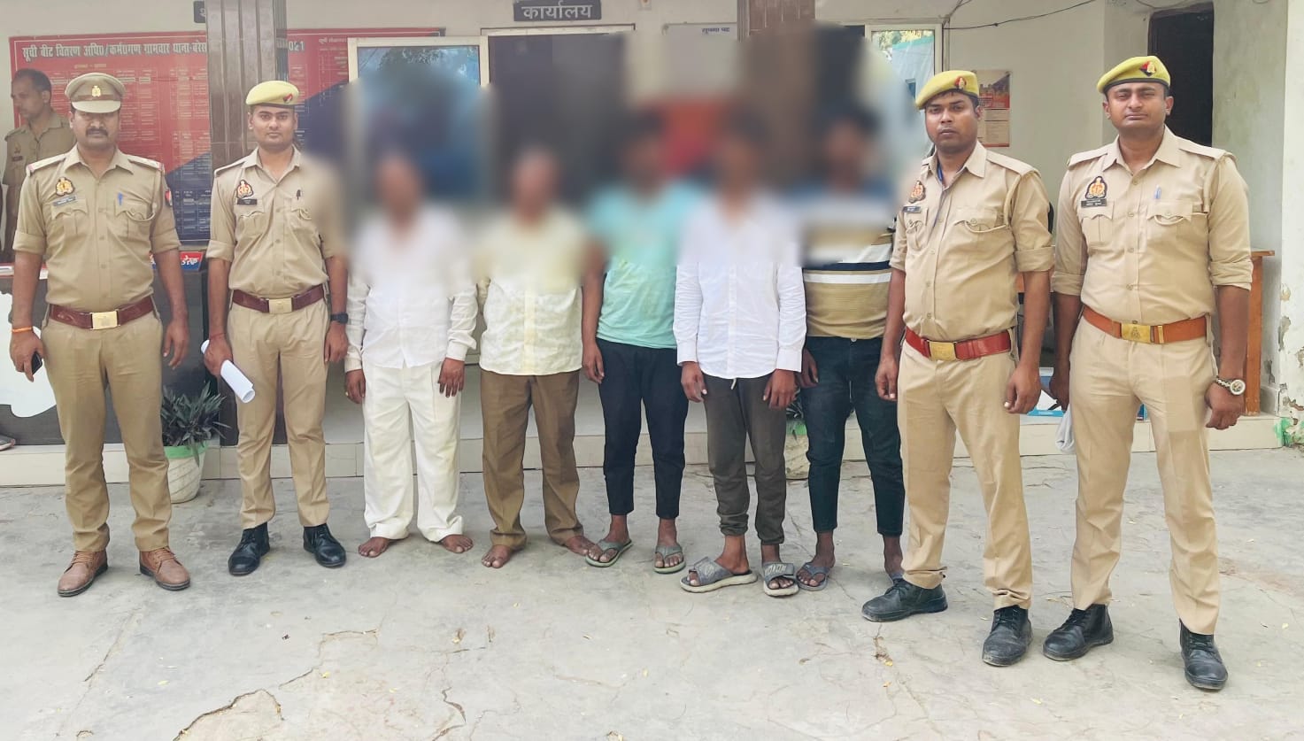 उपनिरीक्षक ओम प्रकाश यादव मय हमराह ने बुधवार को मुखबिर की सुचना पर अभियुक्त तुलसी राजभर पुत्र स्व. मिश्री राजभर, महादेव राजभर पुत्र स्व. मिश्री राजभर, आशीष राजभर पुत्र तुलसी राजभर निवासीगण ग्राम मनीरपुर थाना बरेसर जनपद गाजीपुर तथा शिवशंकर राजभर पुत्र मुन्ना राजभर व धर्मेन्द्र राजभर पुत्र मुन्ना राजभर निवासी ग्राम रजौली थाना करीमुद्दीनपुर जनपद गाजीपुर को शंभु राजभर के बगीचे से गिरफ्तार कर लिया। गिरफ्तार अभियुक्तों के विरुद्ध नियमानुसार विधिक कार्यवाही करते हुए न्यायालय के सुपुर्द किया गया।