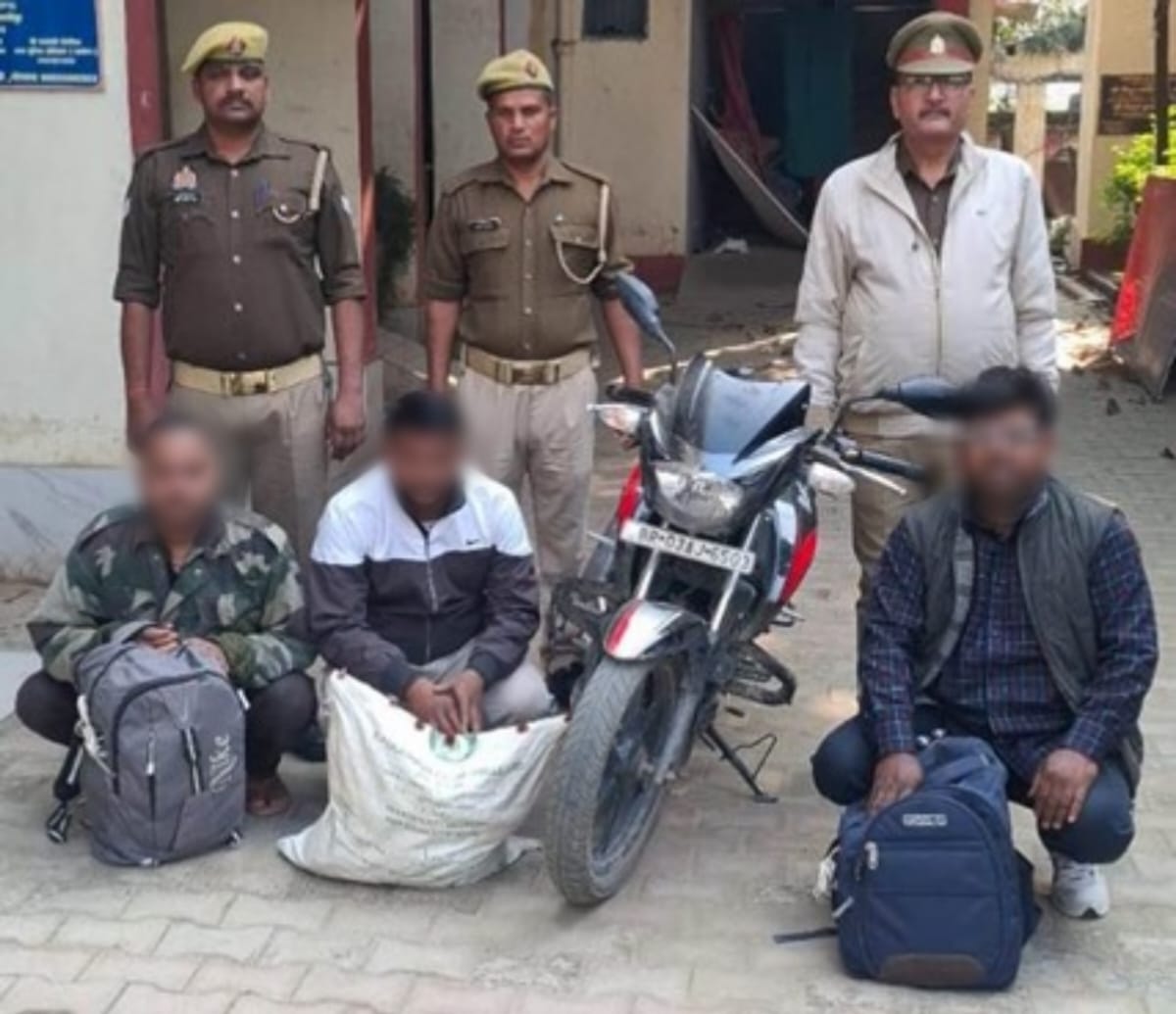 प्रभारी निरीक्षक नोनहरा पवन कुमार उपाध्याय व उपनिरीक्षक अजय कुमार मय हमराह द्वारा निर्माणाधीन ग्रीन फिल्ड़ एक्सप्रेसवे पर रसूलपुर हबीबुल्लाह वाले अण्डरपास के ऊपर सघन चेकिंग किया जा रहा था। उसी दौरान एक मोटर साइकिल मुहम्मदाबाद की ओर से जंगीपुर की तरफ आती दिखाई दी, जिसको रोकने का इशारा किया गया तो मोटर साइकिल चालक मोटर साइकिल घुमा कर तेजी से पीछे की ओर जाने के प्रयास में अनियंत्रित होकर बन्द हो गई। संदिग्ध प्रतीत होने पर तीनों लोगों को पुलिस ने पकड़ लिया गया। जामा तलाशी में मोटर साइकिल चालक के पास से एक पिट्ठू बैंग में कुल 3.070 कि.ग्रा. अवैध गांजा, बीच में बैठे व्यक्ति के कब्जे से एक प्लास्टिक की बोरी में कुल 5.790 कि.ग्रा. अवैध गांजा तथा सबसे पीछे बैंठे व्यक्ति के पिट्ठू बैग से 4.540 कि.ग्रा. अवैध गांजा बरामद हुआ। उक्त तीनों व्यक्तियों से बरामद कुल 13.400 किलो ग्राम अवैध गाँजा के साथ गिरफ्तार किया गया।